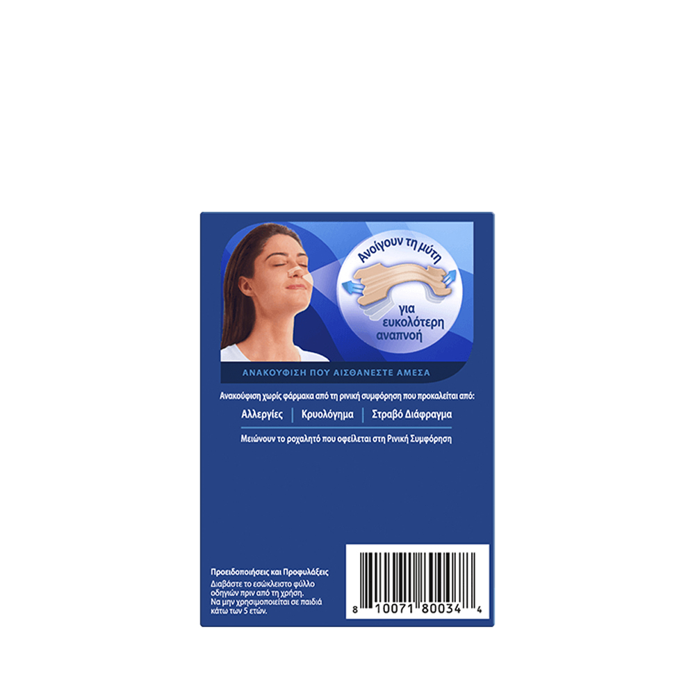 Οι ρινικές ταινίες Breathe Right® μπορούν να χρησιμοποιηθούν, ώστε να ανοίξει η μύτη σας για να εισπνέετε τον αέρα πιο εύκολα και να αναπνέετε καλύτερα, όταν υποφέρετε από ροχαλητό λόγω ρινικής συμφόρησης ή ρινική συμφόρηση που προκαλείται από κρυολόγημα ή αλλεργίες, κατά τη διάρκεια της άσκησης ή όταν απλά χαλαρώνετε.