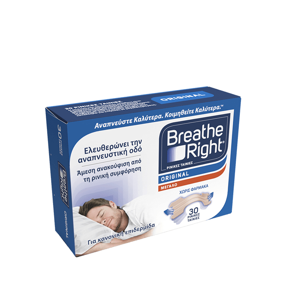 Οι ρινικές ταινίες Breathe Right® είναι εύκαμπτες ταινίες σαν ελατήριο, οι οποίες ανασηκώνουν ελαφρά και ανοίγουν τη μύτη σας, βελτιώνοντας τη ροή του αέρα, ώστε να αναπνέετε καλύτερα. Οι ρινικές ταινίες Breathe Right® ανακουφίζουν άμεσα από τη ρινική συμφόρηση που μπορεί να προκληθεί λόγω κρυολογήματος, αλλεργιών και αποκλίνοντος διαφράγματος.