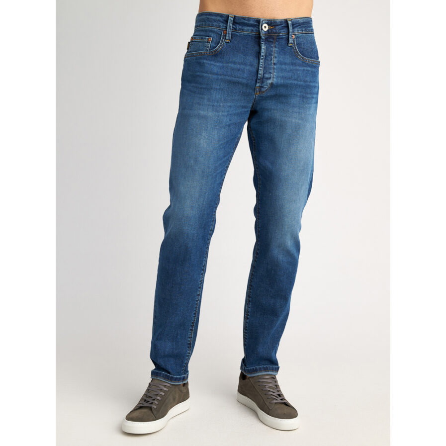 Simon ανδρικό τζιν παντελόνι σε στενή γραμμή με ελαφριές φθορές.