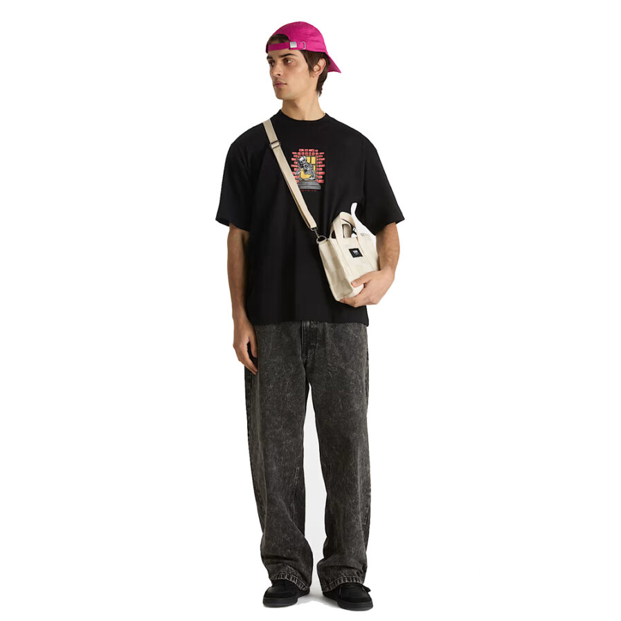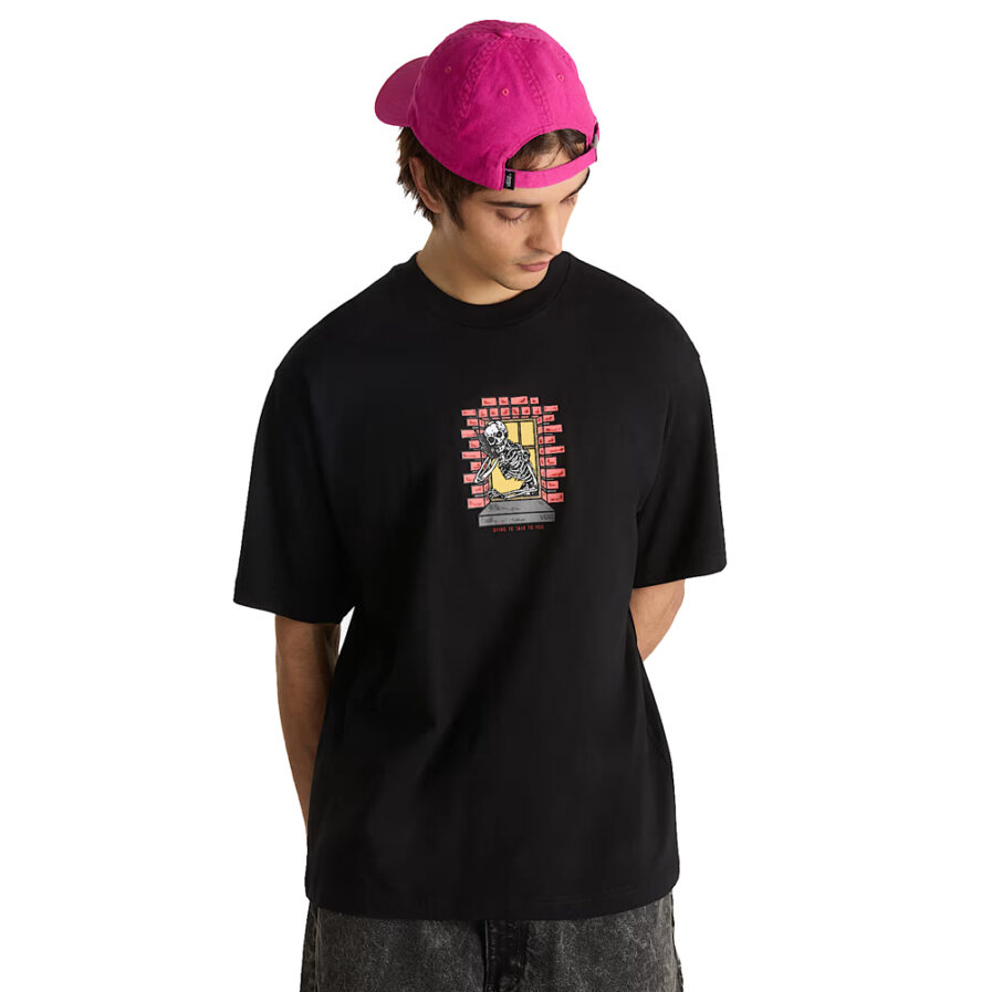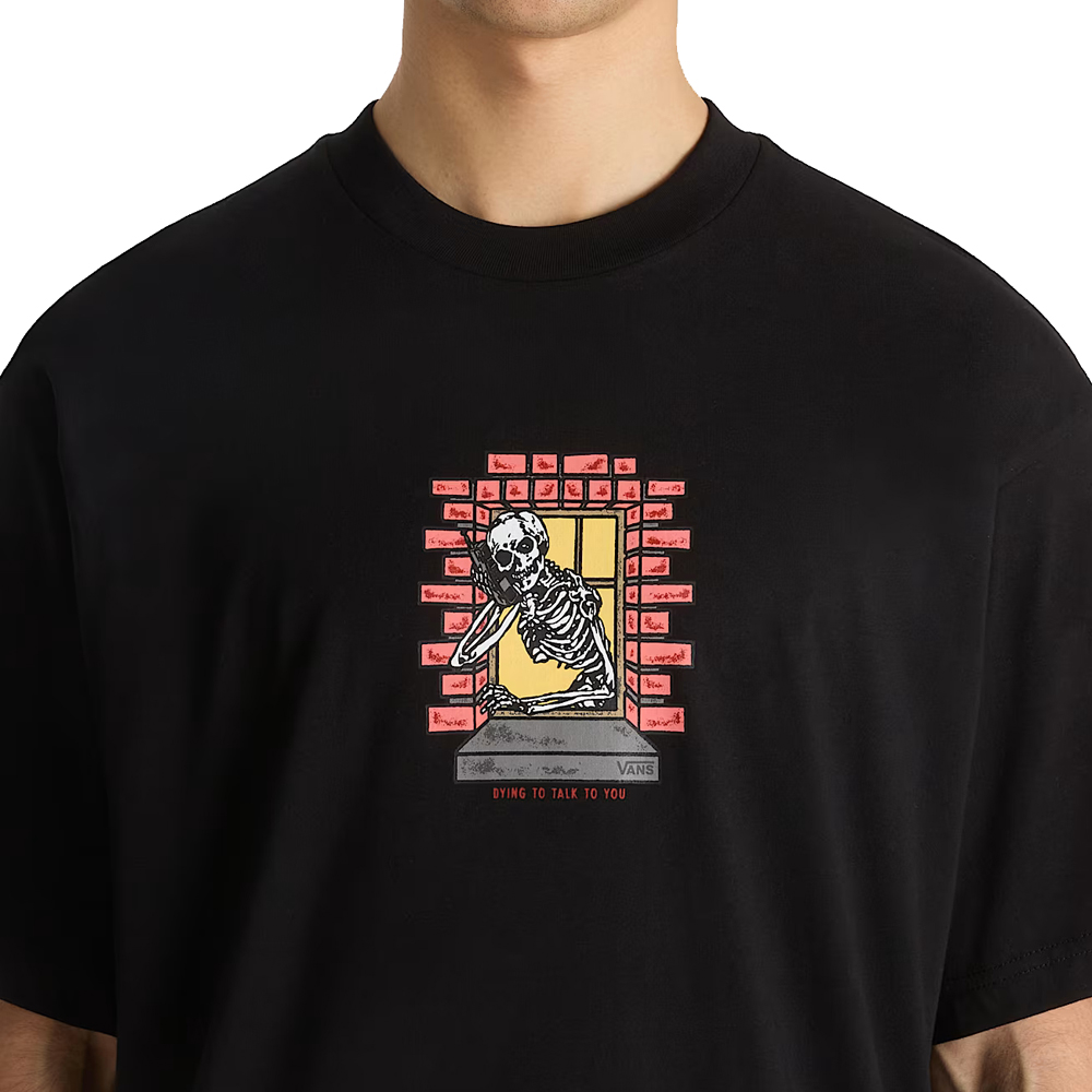 Peer out at the Skull Reaper Window T-Shirt, a loose fit short sleeve crew neck T-shirt with a screenprinted graphic of a skeleton leaning out a window.